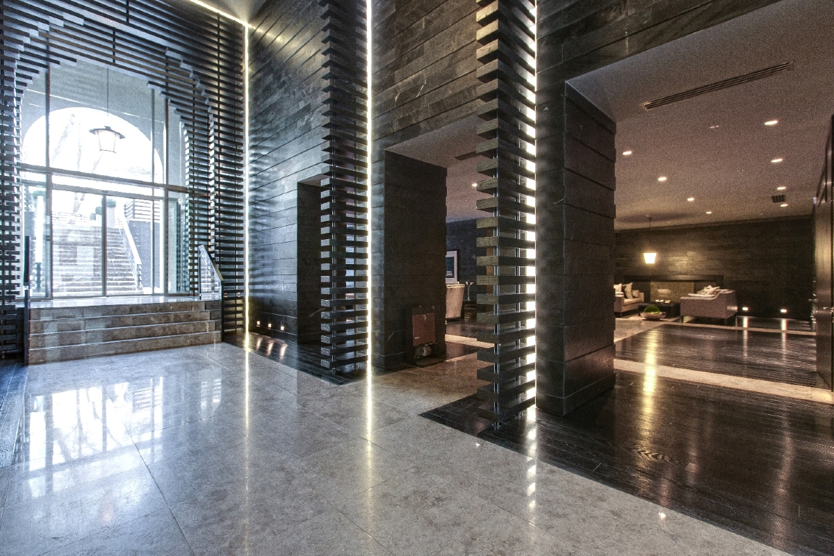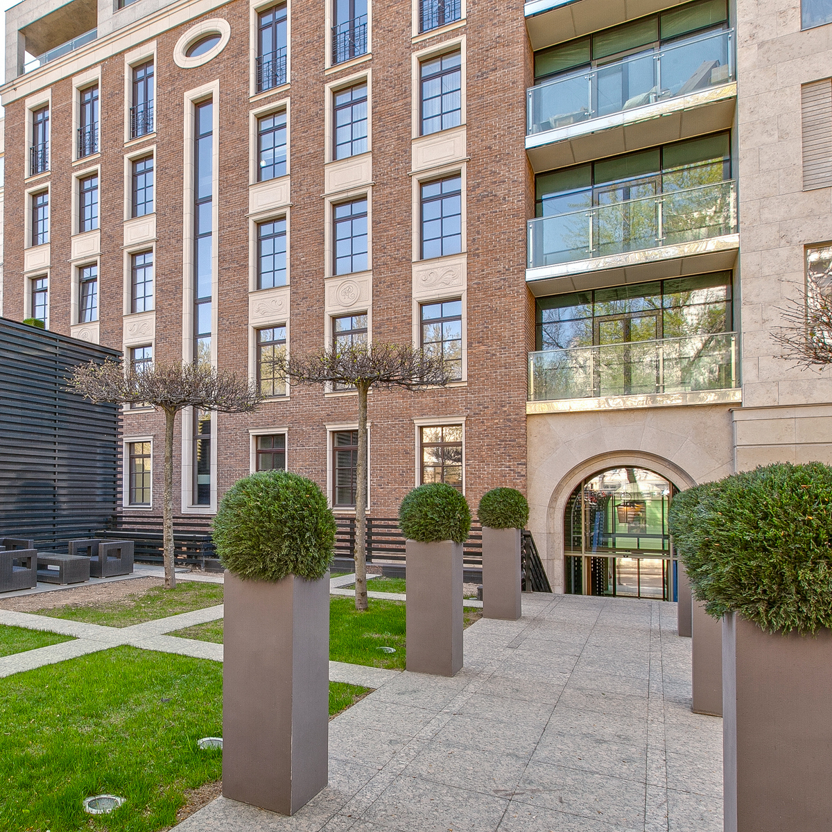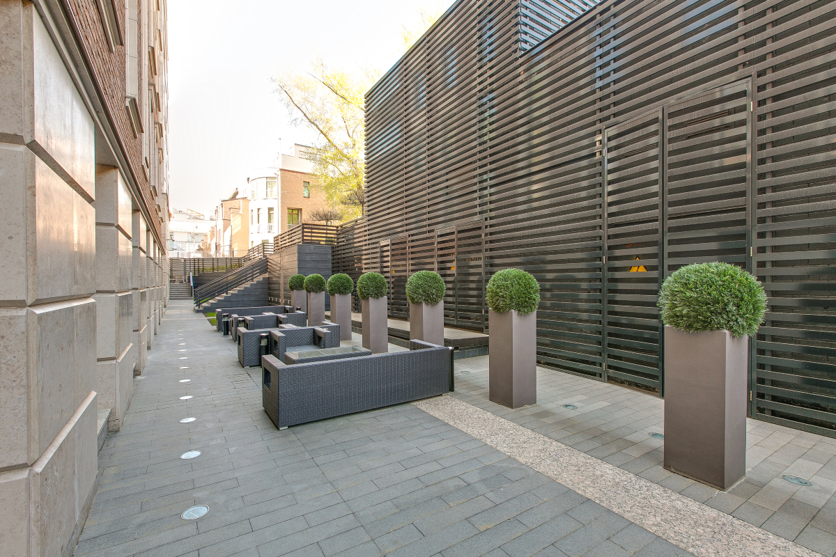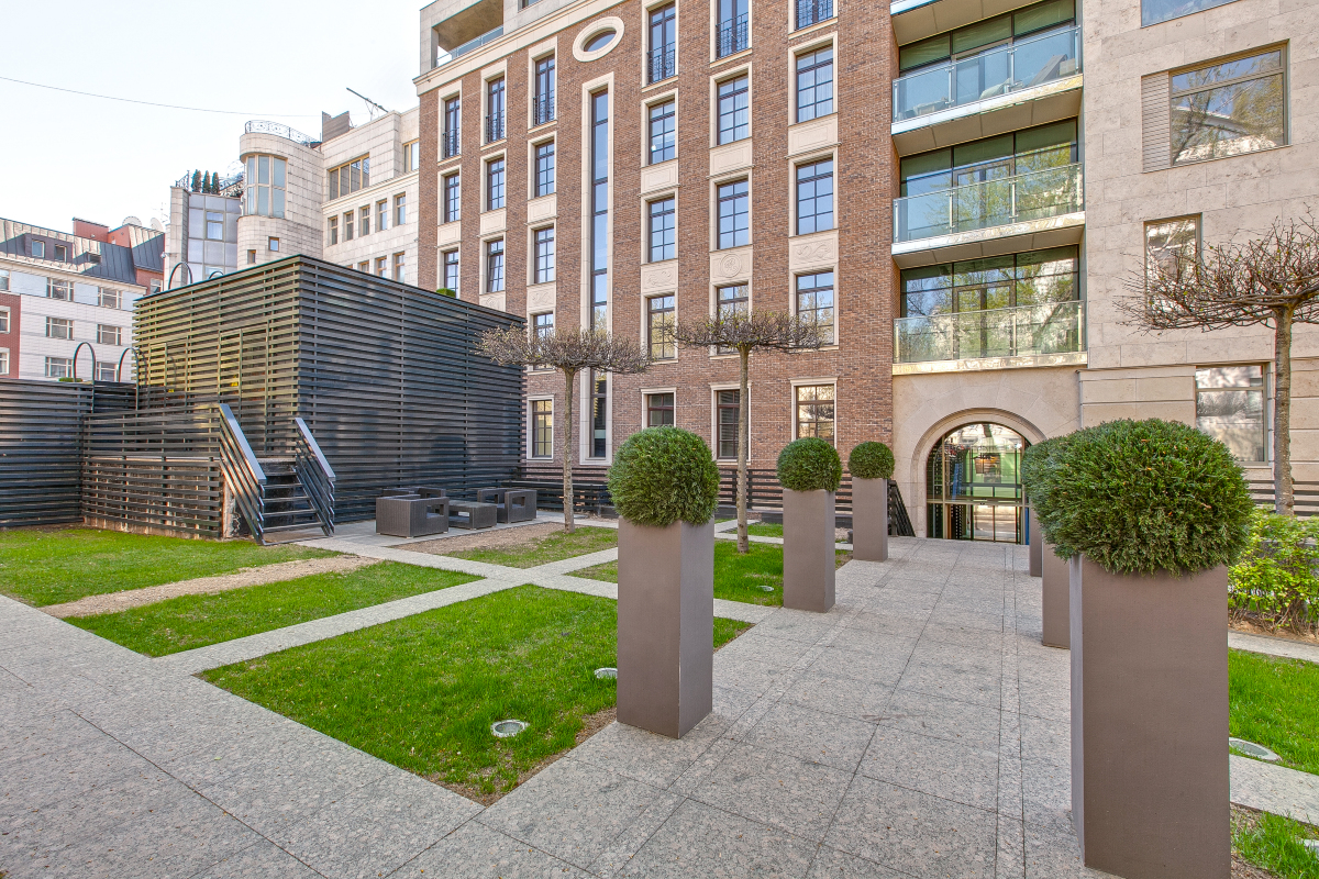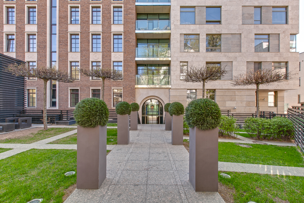В просторном лобби с эффектным дизайном в темных оттенках и высотой потолков 7 метров расположены стойка с консьерж-сервисом, а также приватные зоны для ожидания и встречи гостей. Установлены бесшумные лифты ThyssenKrupp AG, в подземной части дома находится паркинг на 50 машин. Во дворе для жителей оборудовали стильный ландшафтный двор с симметричными клумбами и пышным газоном. В тенистых местах расставили уютную садовую мебель, где можно отдохнуть от городской суеты, почитать или посидеть за чашечкой кофе в семейном кругу.